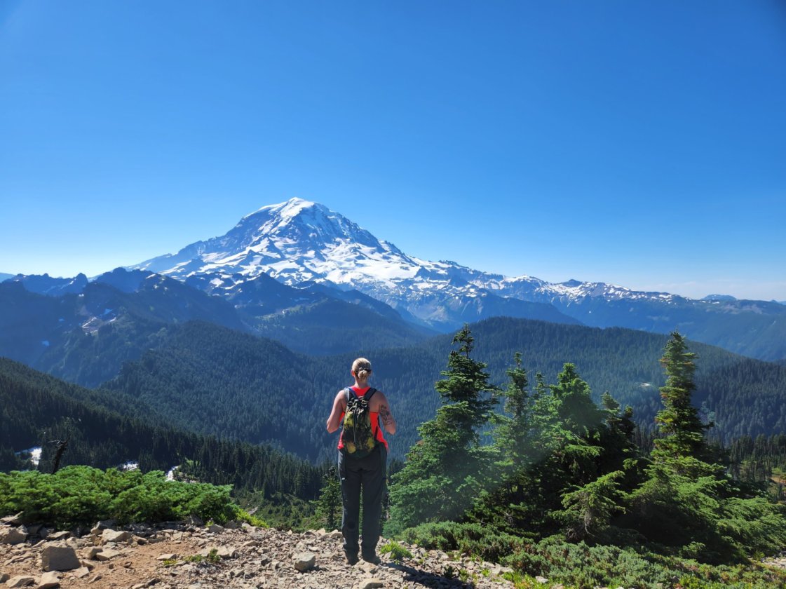 Sneak preview of Mt. Rainier and Eunice Lake on the ridgeline leading to the summit